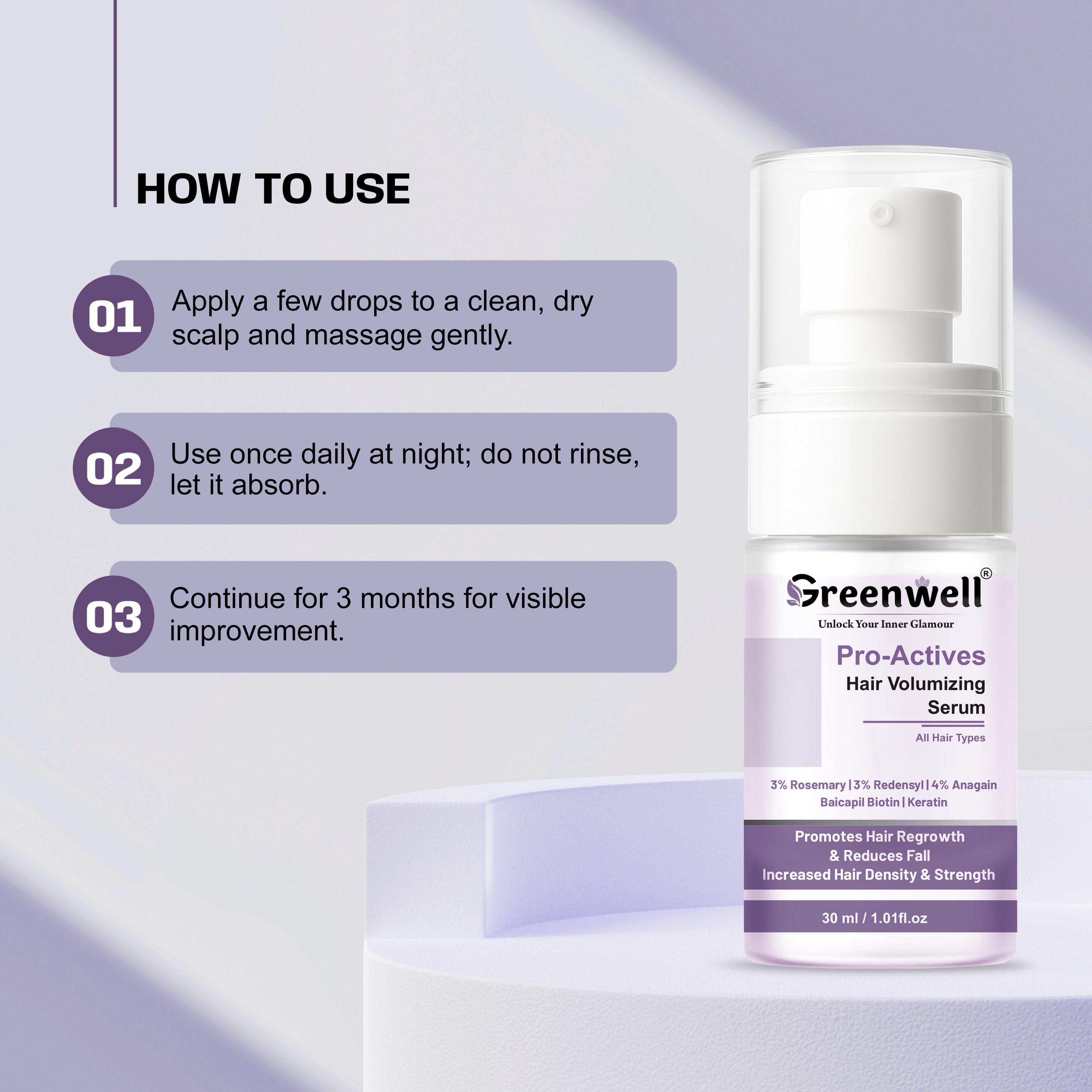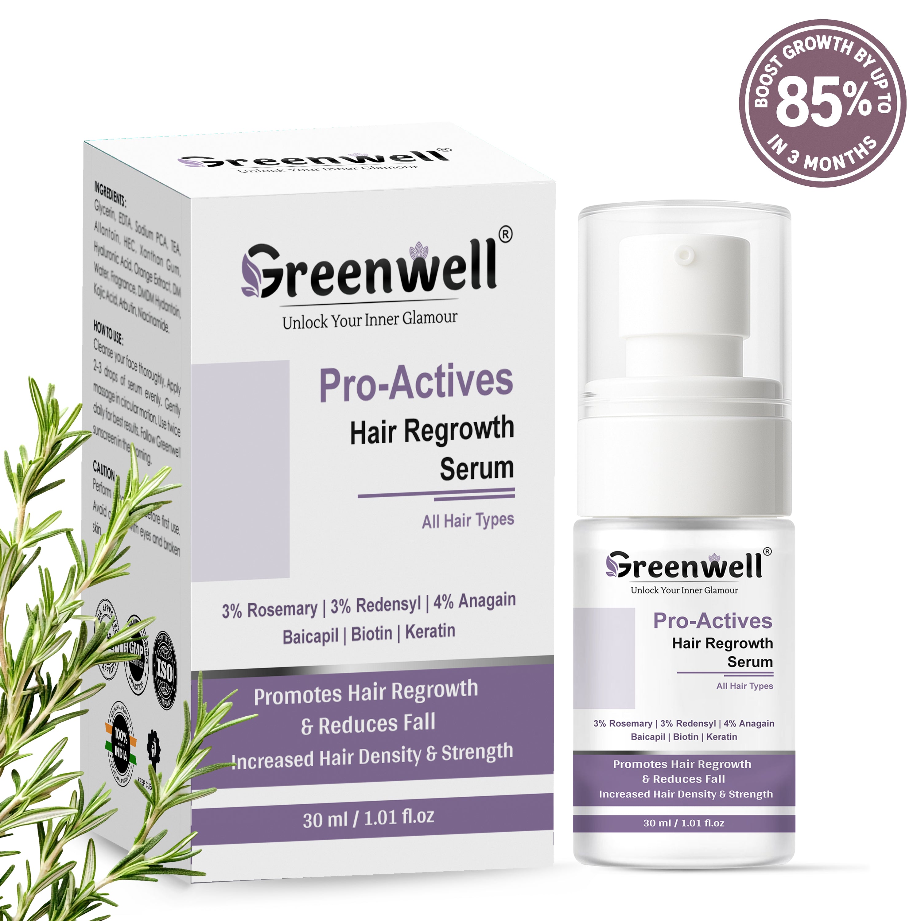 Greenwell Pro-Actives Hair Regrowth Serum is a powerful blend of clinically proven actives designed to reduce hair fall and stimulate visible new growth. Infused with 3% Rosemary, 3% Redensyl, and 4% Anagain along with Baicapil, Biotin, and Keratin, this lightweight, non-greasy serum nourishes the scalp, strengthens hair from the roots, and promotes thicker, healthier hair in just 90 days. Suitable for men and women, all hair types.